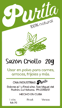 Es un condimento 100% Purita. Una mezcla de especias típicas de la sazón caribeña que le dan un sabor único y especial. Cebollino, cachucha, pimienta dulce, ajo, orégano, laurel, comino, entre otras especias secretas que lo convierten en el rey de la cocina cubana.
